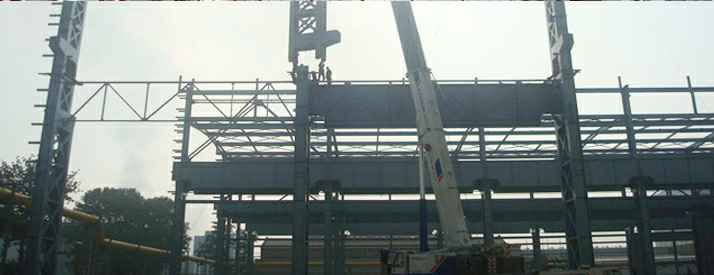 本工程轴线总长228米,轴线总宽132.5米。共四连跨,跨度36米,大柱距18米、小柱距12米,厂房高度高45.85米,四跨均设行车,大行车350T。墙面为C型钢镀锌墙梁,墙板为单层HV-248型彩板,屋面为轻质太空屋面板并做卷材防水,屋面均设通风器。